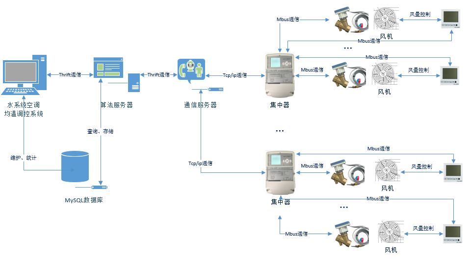 該系統是一款以水系統空調系統項目中的智能監測調控系統,監控空調運行參數為手段,以空調節能運行管理為目的的Web化系統,通過在線監測空調運轉模式、供回水溫度、室內溫度、設定溫度、電量等運能參數,并進行周期采集,進而對數據進行統計、分析,考慮到供暖、制冷過程中房屋日照朝向及風盤遠近程度主要因素,在此基礎上建立一套相應的空調節能管理模型,通過配以集中控制、水力平衡、預先調控、分時控制、分區控制等全方位調控手段,最終達到在線空調的節能運行管理,通過調控實現建筑空調用電節能10%~15%以上。